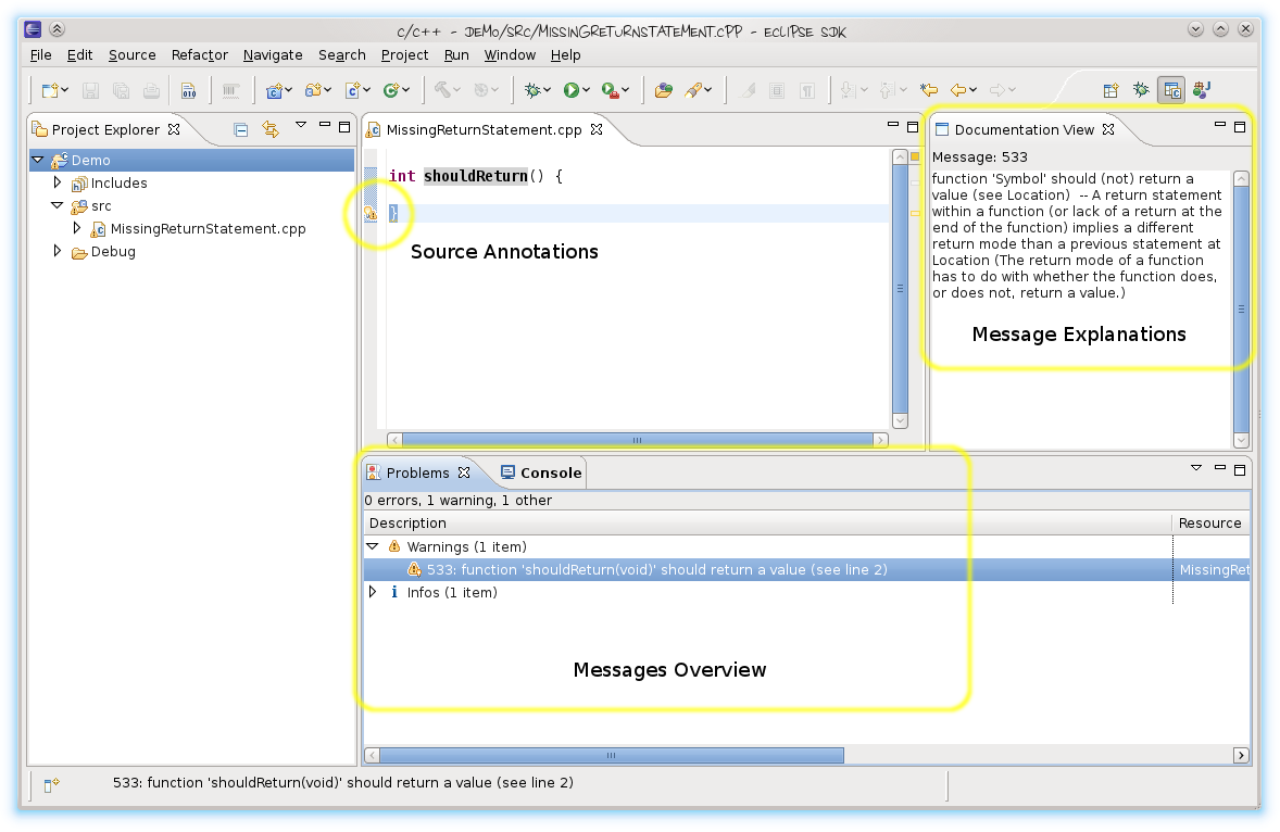 Lint provides valuable feedback on programming style and common programmer mistakes. Our Linticator plug-in for Eclipse CDT runs Lint (PC-lint Plus, Flexe/PC-Lint) and annotates your source code with Lint messages. For some messages, we provide quickfixes that let you quickly correct a warning.